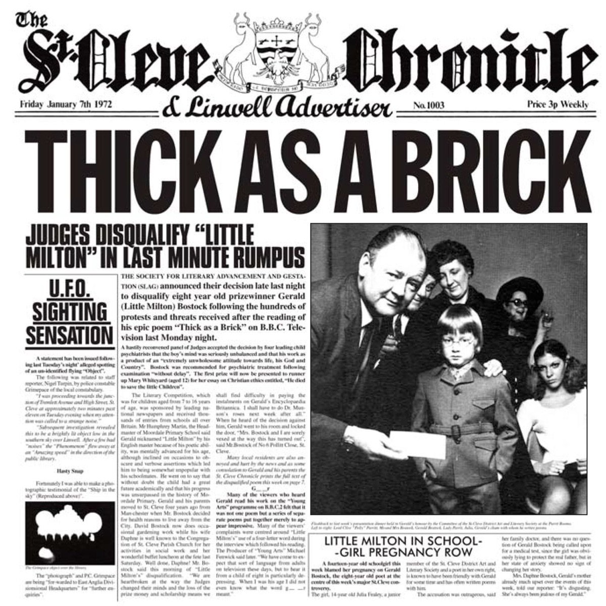 El embalaje original de Thick As A Brick fue diseñado para parecerse a un periódico, lo que aseguraba a los lectores que el contenido era la adaptación musical de la banda de un poema escrito por el genio de siete años Gerald «Little Milton» Bostock, una obra que le había valido a Bostock un premio de la Sociedad para el Avance y la Gestación Literaria.
